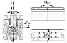 - 滑塊導軌系統的許用扭矩 這些數值是單一載荷,當執行器的下部完全被支承時使用。 當承受聯合載荷時,這些值必須減小。